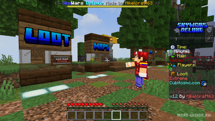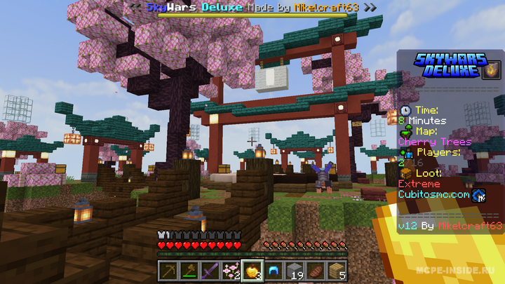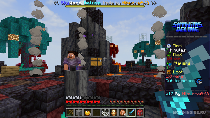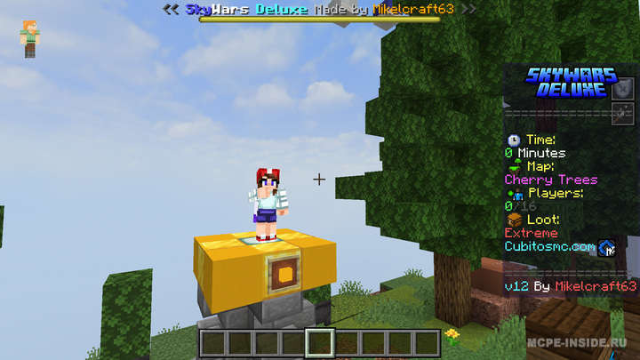 SkyWars Deluxe – динамичный PvP-режим, где до 16 игроков сражаются на летающих островах, собирают ресурсы и оружие, чтобы стать последним выжившим. Доступны различные наборы, автоматические ловушки, система рангов, мини-игры и настройка сложности.