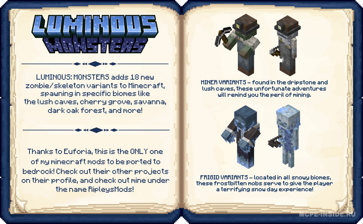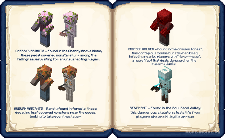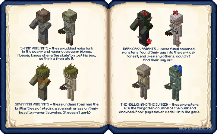 Теперь в вашем мире будет генерироваться 18 новых вариантов зомби и скелетов, каждый из которых находится в своей среде обитания. Тематически мобы похожи на биом, в котором находятся.