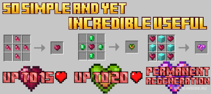 Модификация добавляет в игру усиленные характеристики, включая увеличенное здоровье (до 20 сердец) и постоянное восстановление. С ним вы сможете справляться с любыми сложностями, делая игровой процесс проще и динамичнее.