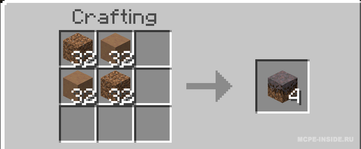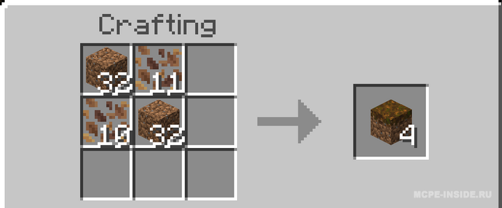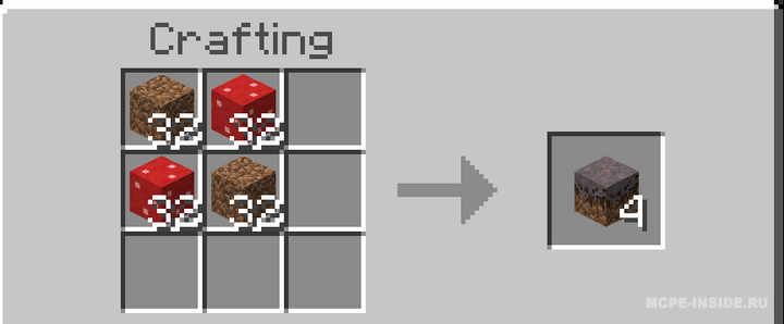 Этот мод позволяет изготавливать подзол и мицелий в режиме выживания. Подзол создается из грязи и опавших листьев, а мицелий — из грязи и блоков красных или коричневых грибов. Включены все необходимые рецепты для крафта этих материалов.