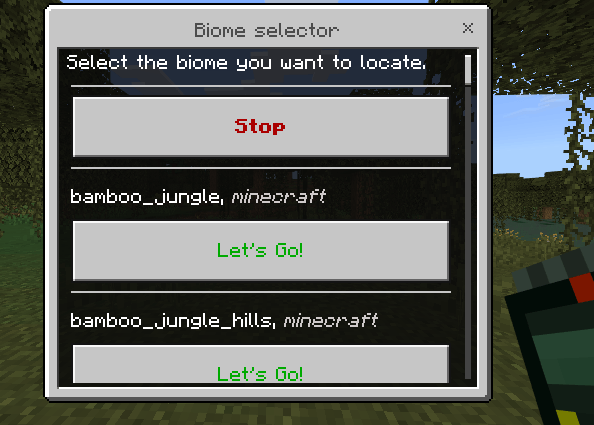 Локатор биомов позволяет находить и мгновенно перемещаться в любой биом. Для использования откройте интерфейс с сортировкой биомов по алфавиту, выберите нужный и активируйте перемещение кнопкой «Поехали!» — отмена действия доступна через «Стоп».