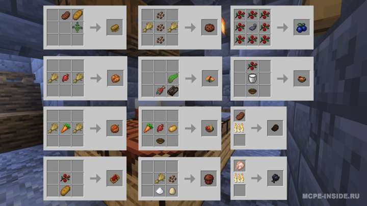 Модификация добавляет в игру 12 новых блюд, созданных из стандартных ингредиентов, чтобы разнообразить игровой процесс. Разные продукты по-разному восполняют голод: от быстрых перекусов вроде печенья до сытных блюд, таких как сэндвич с говядиной или йогурт с ягодами.