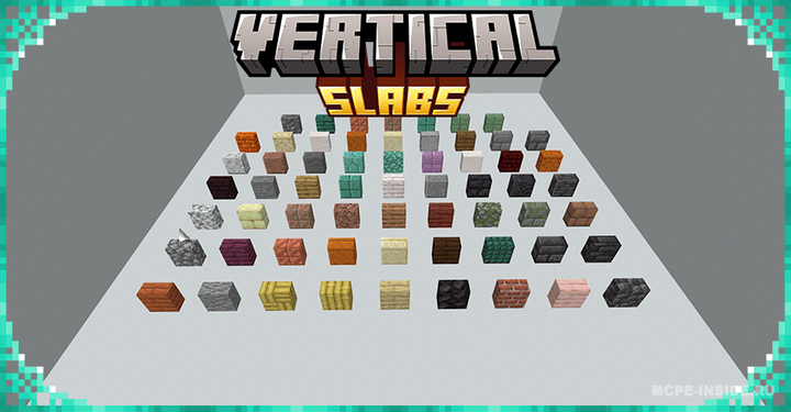 Вертикальные Плиты добавляют в игру более 60 новых вариантов вертикальных плит, включая дерево, камень и другие блоки. Они идеально сочетаются с оригинальными текстурами игры и совместимы с любыми пакетами текстур, открывая новые возможности для строительства и декора.